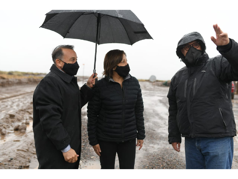 En una jornada lluviosa y acompañada por el presidente del Concejo Municipal, Ariel Rivero, la Gobernadora verificó la continuidad de la obra de riego.