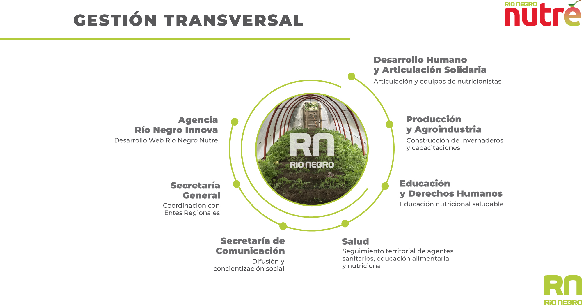 El Río Negro Nutre plantea un abordaje que trasciende la competencia exclusiva de los organismos vinculados a la temática alimentaria. Involucra a todo el Estado rionegrino, generando condiciones que posibilitan el acceso de la población a los alimentos frescos.