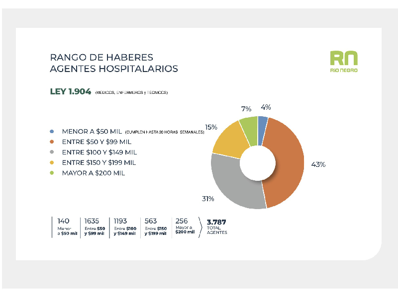 El sistema público de salud de Río Negro cuente con 2582 profesionales, entre médicos y técnicos, y a quienes se suman 1205 enfermeros. En tanto, hay 7452 agentes hospitalarios (Ley 1904: 3787; Ley 1844: 3538; Residentes: 127)