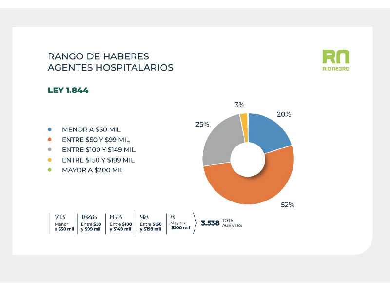 Río Negro destina el 24% de su masa salarial al sector salud, con $911.382.666 anuales. La distribución de los salarios varía de acuerdo a las leyes que incluyen a los trabajadores y la cantidad de hora semanales trabajadas.