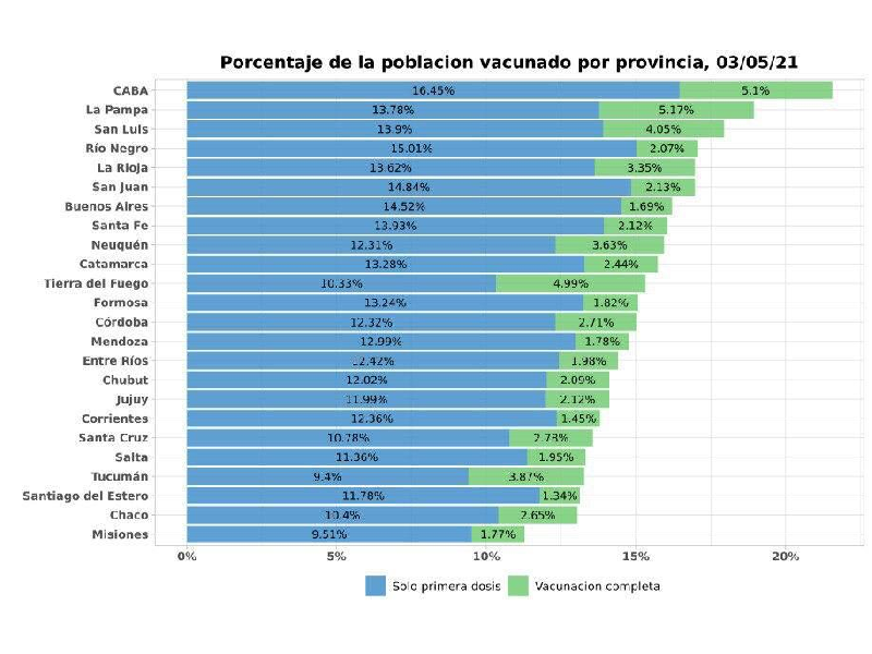 De acuerdo al informe, en Río Negro la vacunación contra el COVID-19 llegó al 17,08% de la población objetivo. Se ubica en cuarto lugar, solo por debajo de CABA (21,5%), La Pampa (18,8%) y San Luis (18,4%).